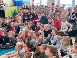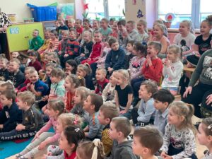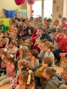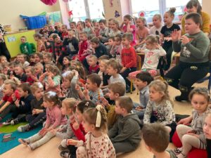 z Krakowa. Tym razem był to pokaz magii na wesoło – Wyczarujmy sobie jajeczko wielkanocne. Wojciech Janeczek uczestnik programu Mam Talent zaprezentował naszym przedszkolakom magiczne sztuczki m.in. lewitujące kwiaty, pojawiające się monety, przenikające okręgi. Pokaz ten dostarczył dzieciom mnóstwa radości, zaciekawienia