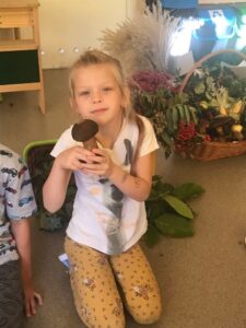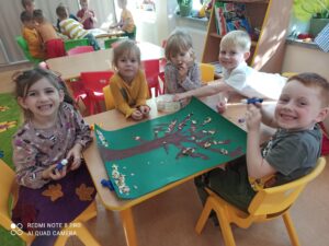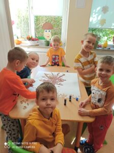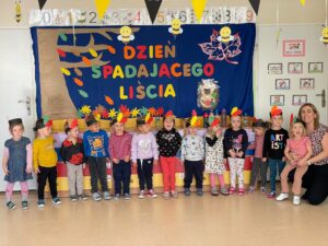 23 września to pierwszy dzień jesieni, który w naszym przedszkolu obchodzony jest jako dzień spadającego liścia. Każda grupa przedszkolna radośnie witała Panią Jesień. Dzieci przyniosły do przedszkola jesienne dary. Wspólnie z nauczycielkami stworzyły kolorowe jesienne kąciki przyrody.  3 – latki nauczyły się nowej piosenki pt. „Kolorowe listki”. Wykonały prace plastyczną jesienne drzewko. 6 – latki rozwiązywały zagadki, które pomogły im utrwalić wiedzę dotyczącą zmian zachodzących w przyrodzie, a dokładniej pór roku. W grupie 5 – latków powstały grupowe prace plastyczne o tematyce jesiennej. Jagódki i Wróbelki wesoło bawiły się przy zabawach muzyczno – ruchowych o tematyce jesiennej.