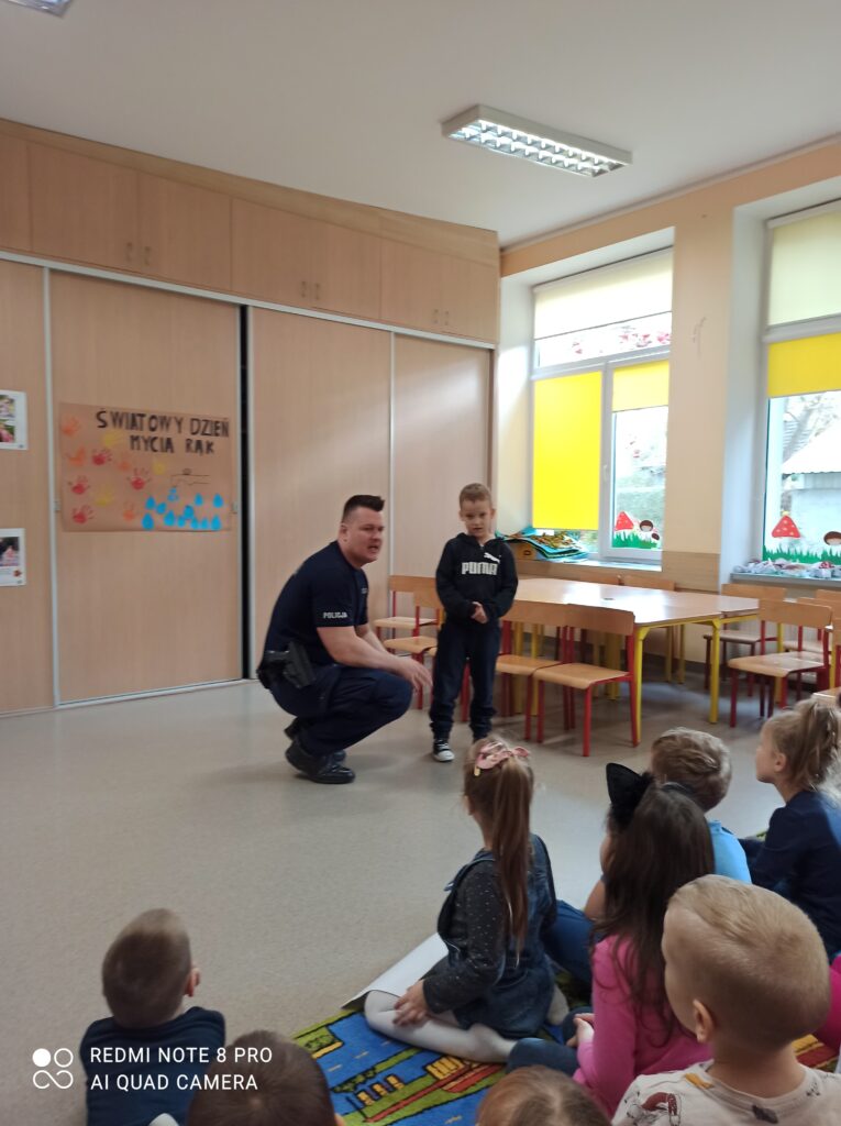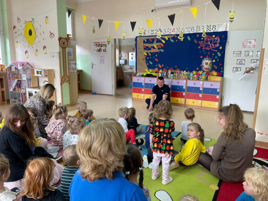 Dnia 18 października 2022r. przedszkolaki miały przyjemność gościć pana policjanta z Powiatowej Komendy Policji w Kołobrzegu. Celem wizyty było przypomnienie podstawowych zasad bezpieczeństwa. Pan policjant przybliżył dzieciom podstawowe zasady bezpiecznego poruszania się po drogach, przypomniał numery alarmowe oraz zasady zachowania się podczas spotkania z nieznajomym. Przypominał również o konieczności noszenia ubrań i obuwia posiadającego elementy odblaskowe. Jak zwykle dużym zainteresowaniem cieszyła się prezentacja wyposażenia policyjnego, niezbędnego podczas wykonywania pracy policjanta.