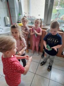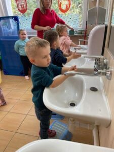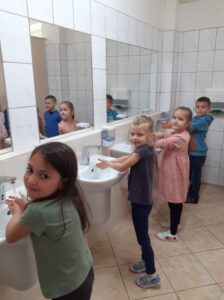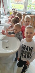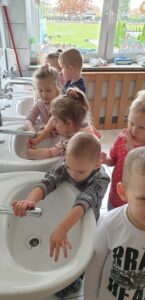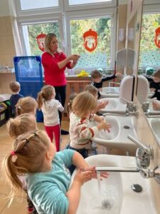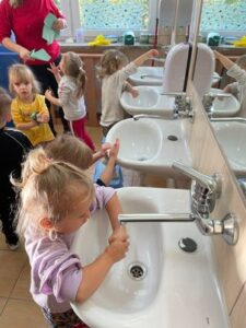 W poniedziałek 17 października 2022 r. Przedszkolaki włączyli się w obchody Światowego Dnia Mycia Rąk . Rozmawiały z nauczycielkami na temat zarazków i bakterii, dowiedziały się, jakie znaczenie dla zdrowia ma częste i dokładne mycie rąk. Omówiony został także schemat mycia rąk, który później wszystkie przedszkolaki zastosowały w praktyce. Każde z dzieci samodzielnie i zgodnie z instrukcją umyło swoje ręce. Dla wielu z nas mycie rąk to bardzo prozaiczna czynność ale należy  zapamiętać, że na naszej skórze żyją różne drobnoustroje, które zostawiamy na wszystkich przedmiotach przez nas dotykanych.
