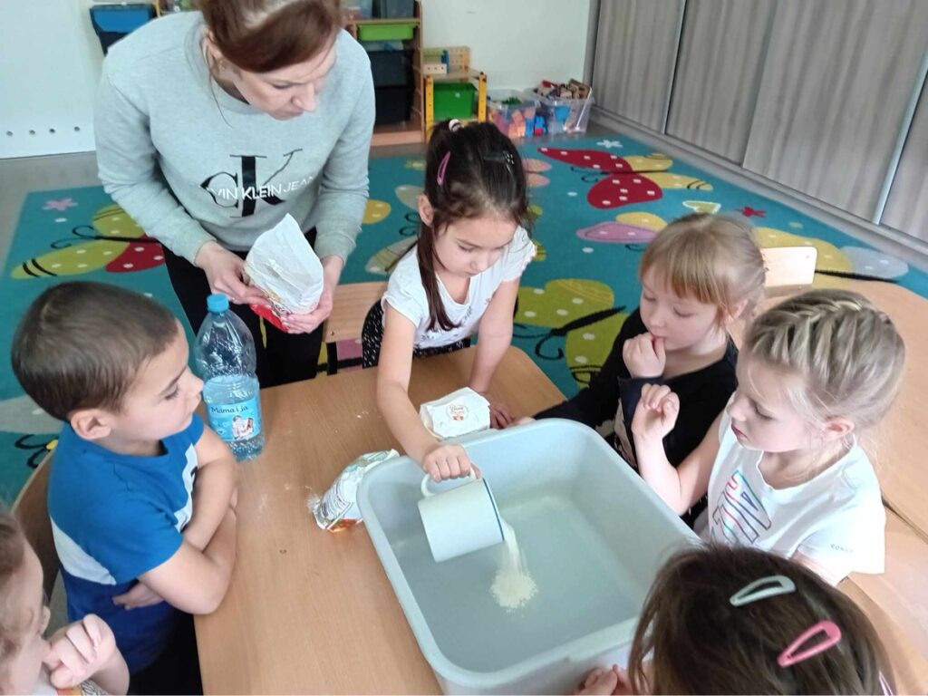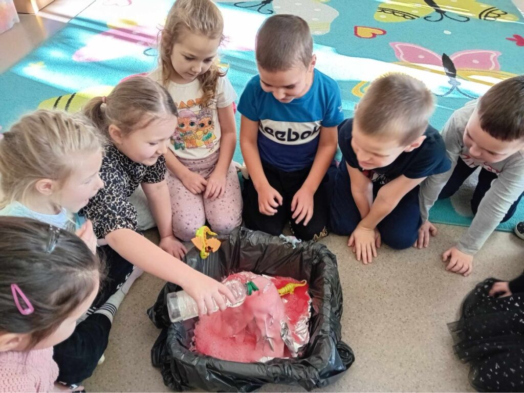 23.02.2024 r. dzieci z grup Krasnale i Biedroneczki wzięły udział w kolejnych warsztatach realizowanych w ramach Innowacji Pedagogicznej pt.: „Zabawa bawi i uczy”. Tym razem dzieci uczestniczyły w zajęciach przyrodniczo- plastycznych.pt.: „W świecie wulkanów.” Wprowadzeniem do tematu był krótki film edukacyjny. Dzięki niemu dzieci dowiedziały się co to są wulkany, jak powstają, dlaczego wybuchają oraz jakie są przyczyny ich powstawania. Zainspirowani filmem postanowiliśmy wykonać swój własny „ wulkan” Dzieci chętnie brały udział w eksperymencie podczas, którego z krateru wydobywała się lawa. Na zakończenie zajęć każdy przedszkolak uformował swój wulkan z masy solnej, którą wcześniej wspólnie przygotowaliśmy.